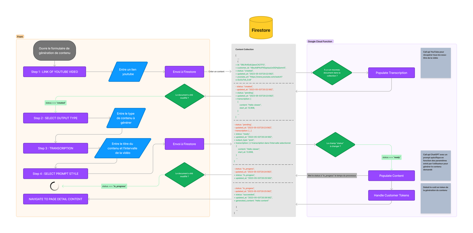 Cette façon de faire nous permet d'exécuter les Google Cloud Fonction et de changer le step du formulaire en fonction du status du contenu qui change dans la base de données.